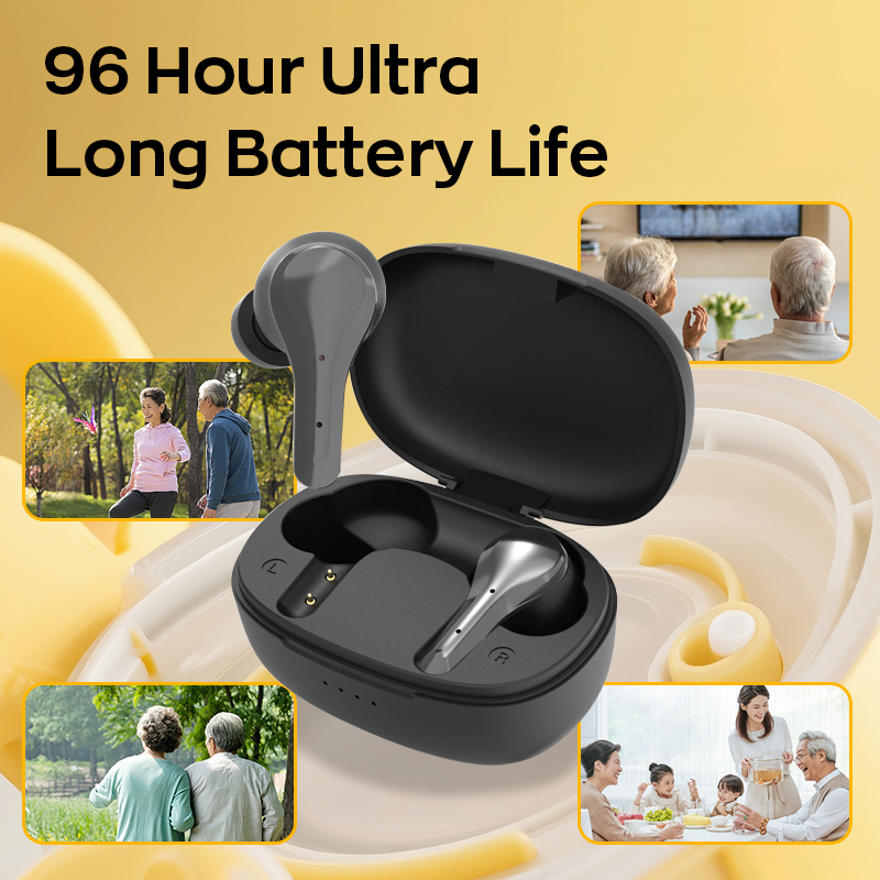 The ergonomic earbud shape fits securely for long hours, and the 96-hour rechargeable battery allows full-day use without frequent charging.